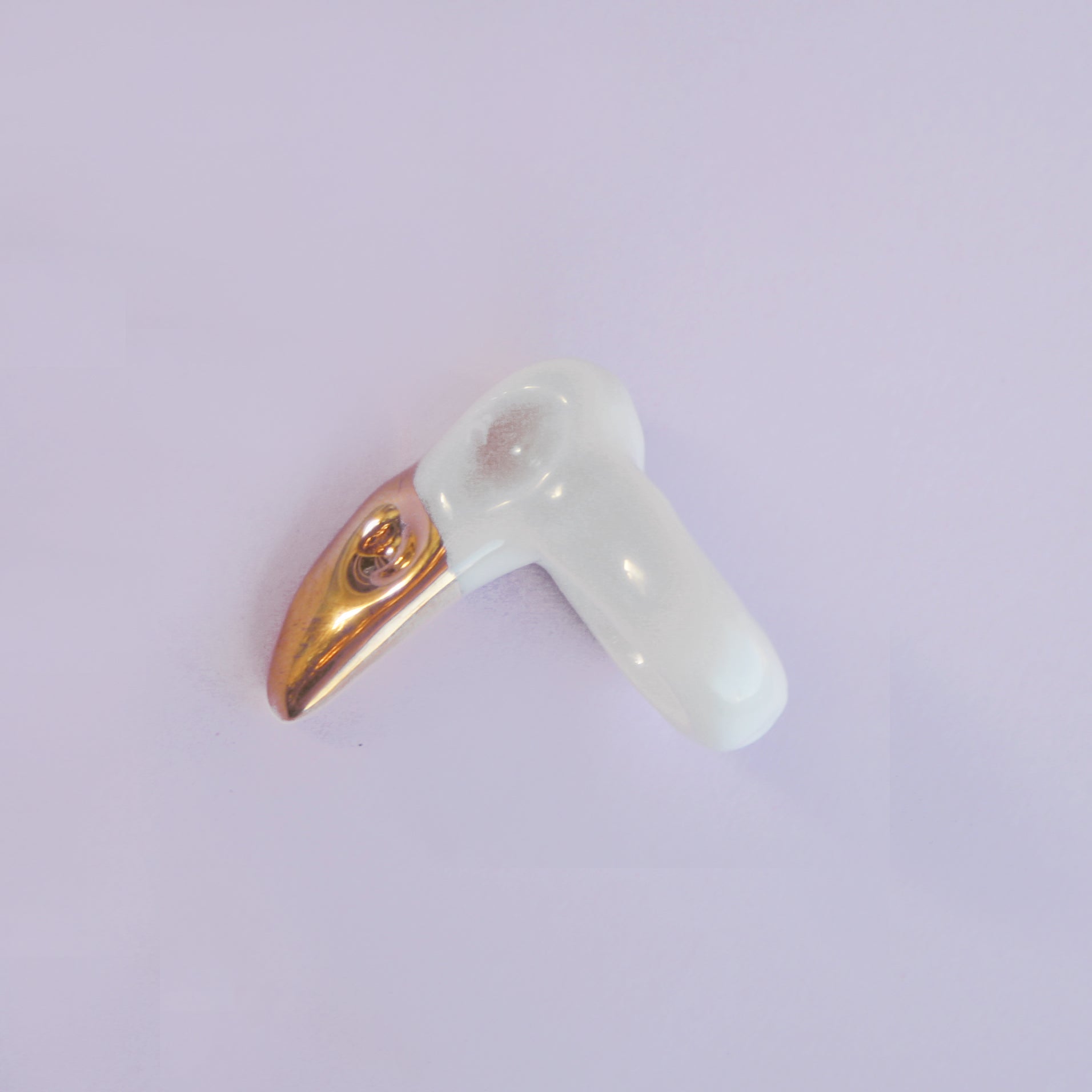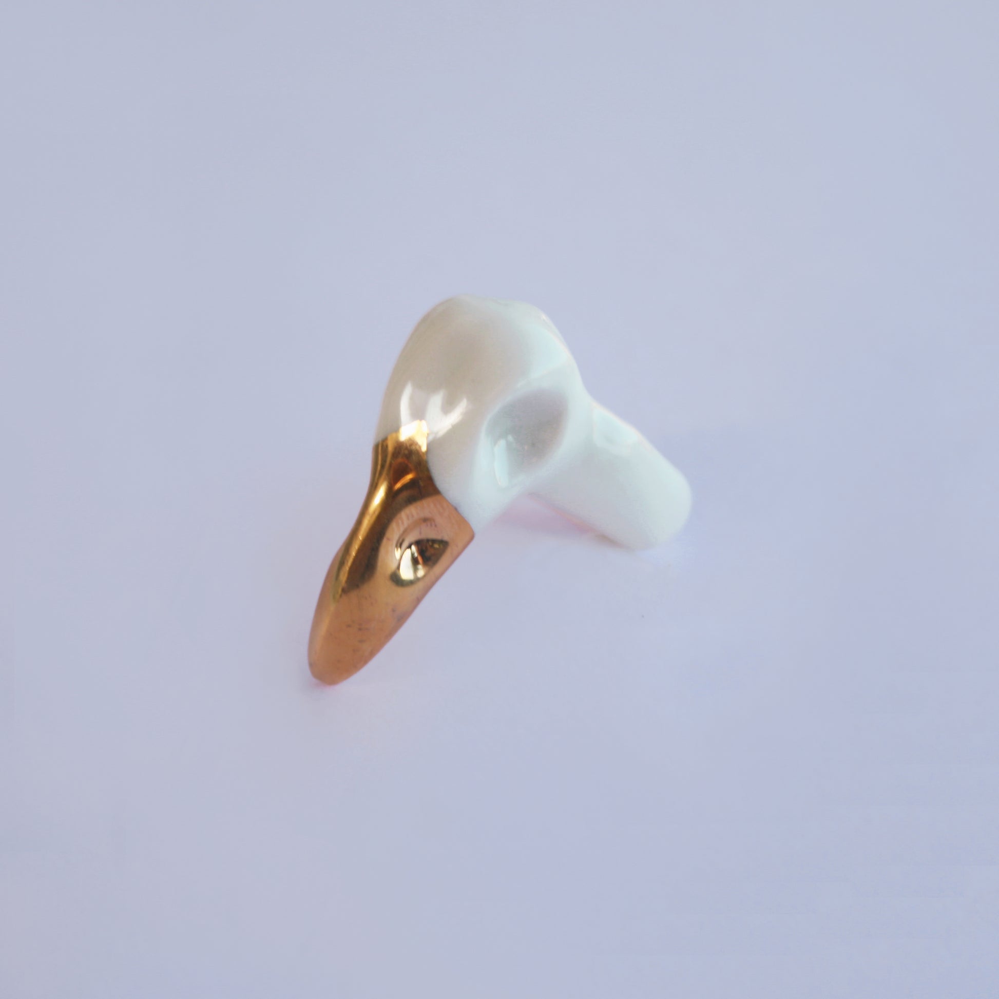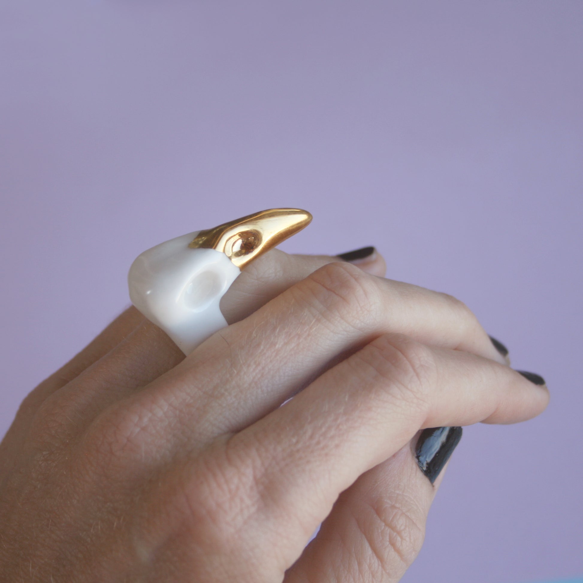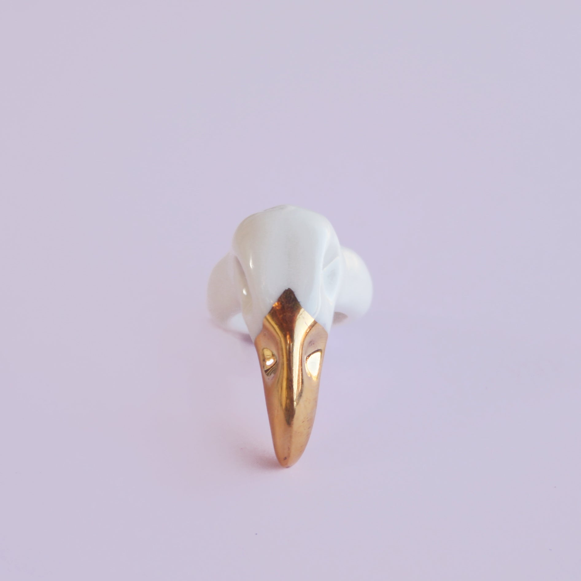 Beautifully shaped crow skull statement ring, handsculpted in porcelain with shiny 22k gold beak.