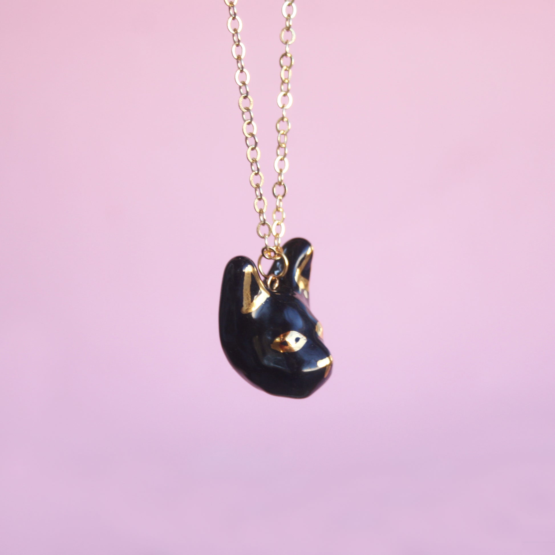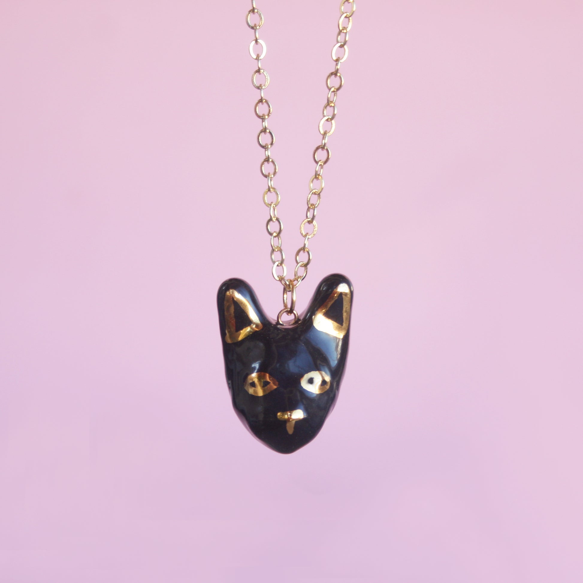 Black Cat Head Pendant with shiny gold details.