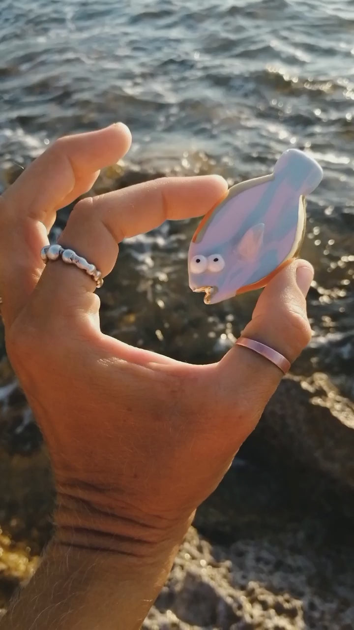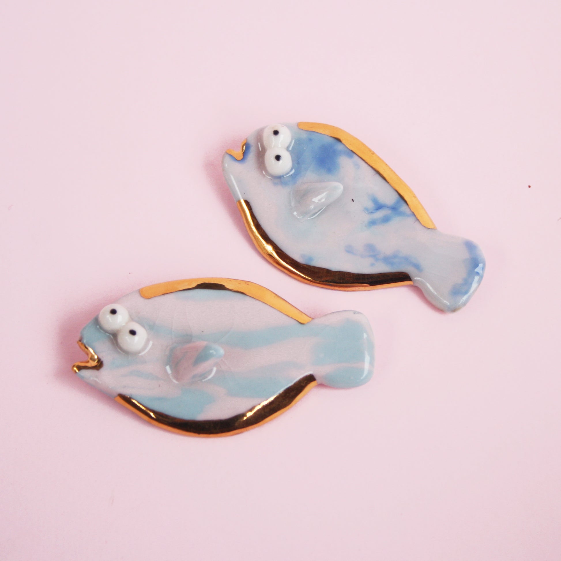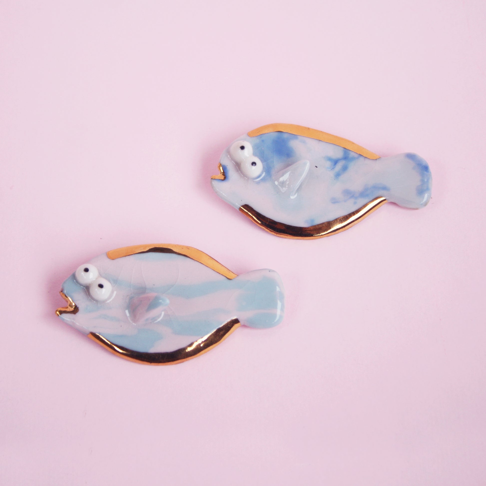 Flat fish marbled porcelain brooches with gold lustre details are a perfect whimsical touch to your summer outfit.