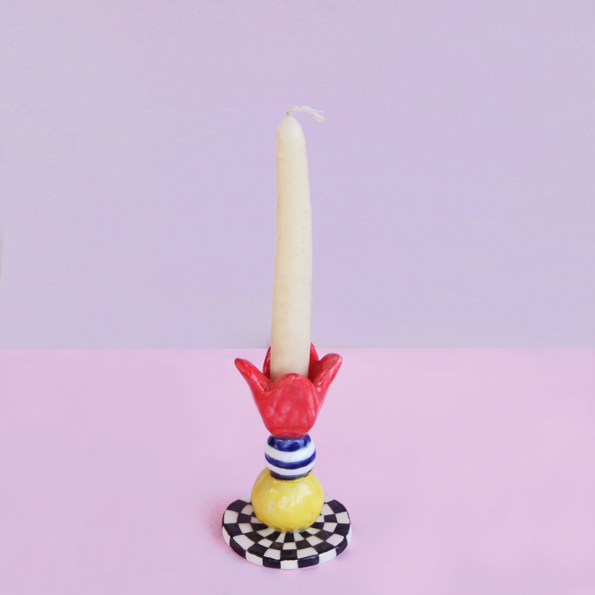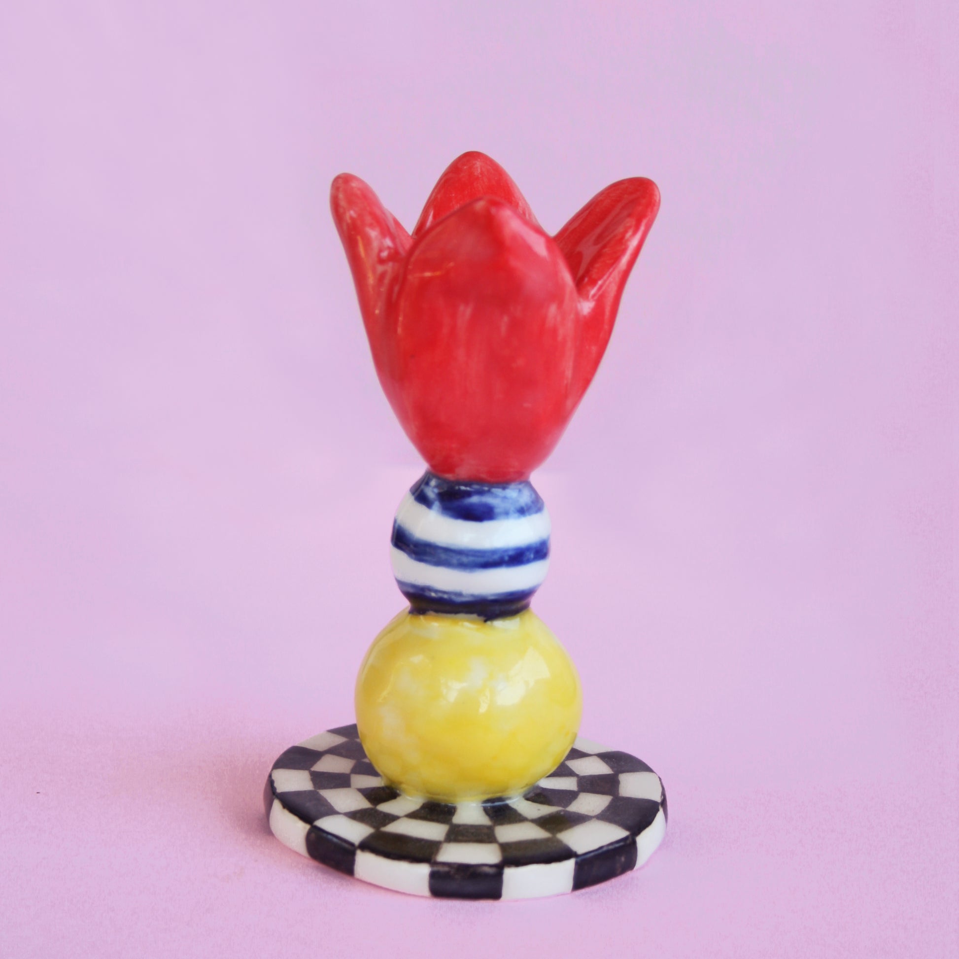 Ceramic candle holder with red tulip, decorated with patterns and checkered base.