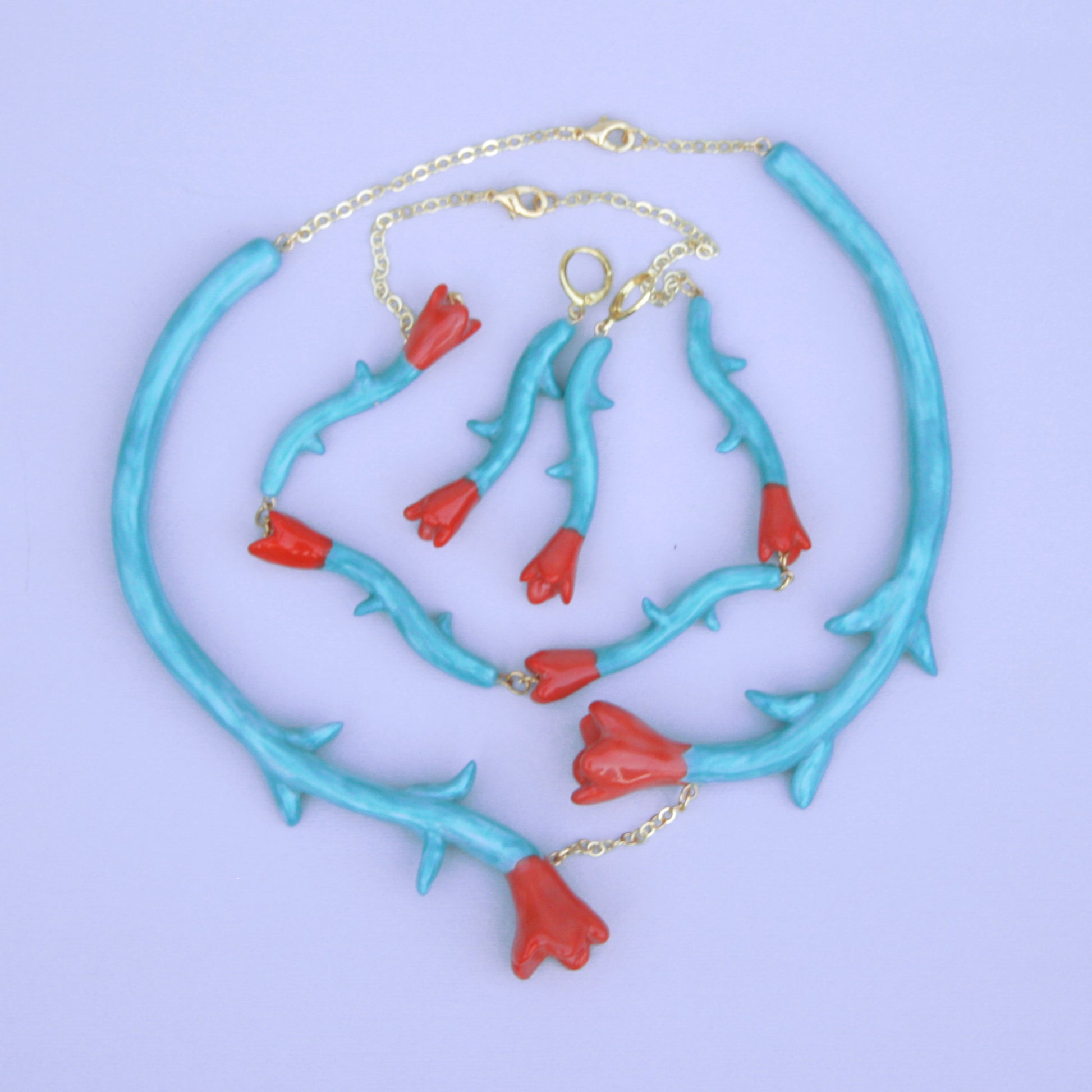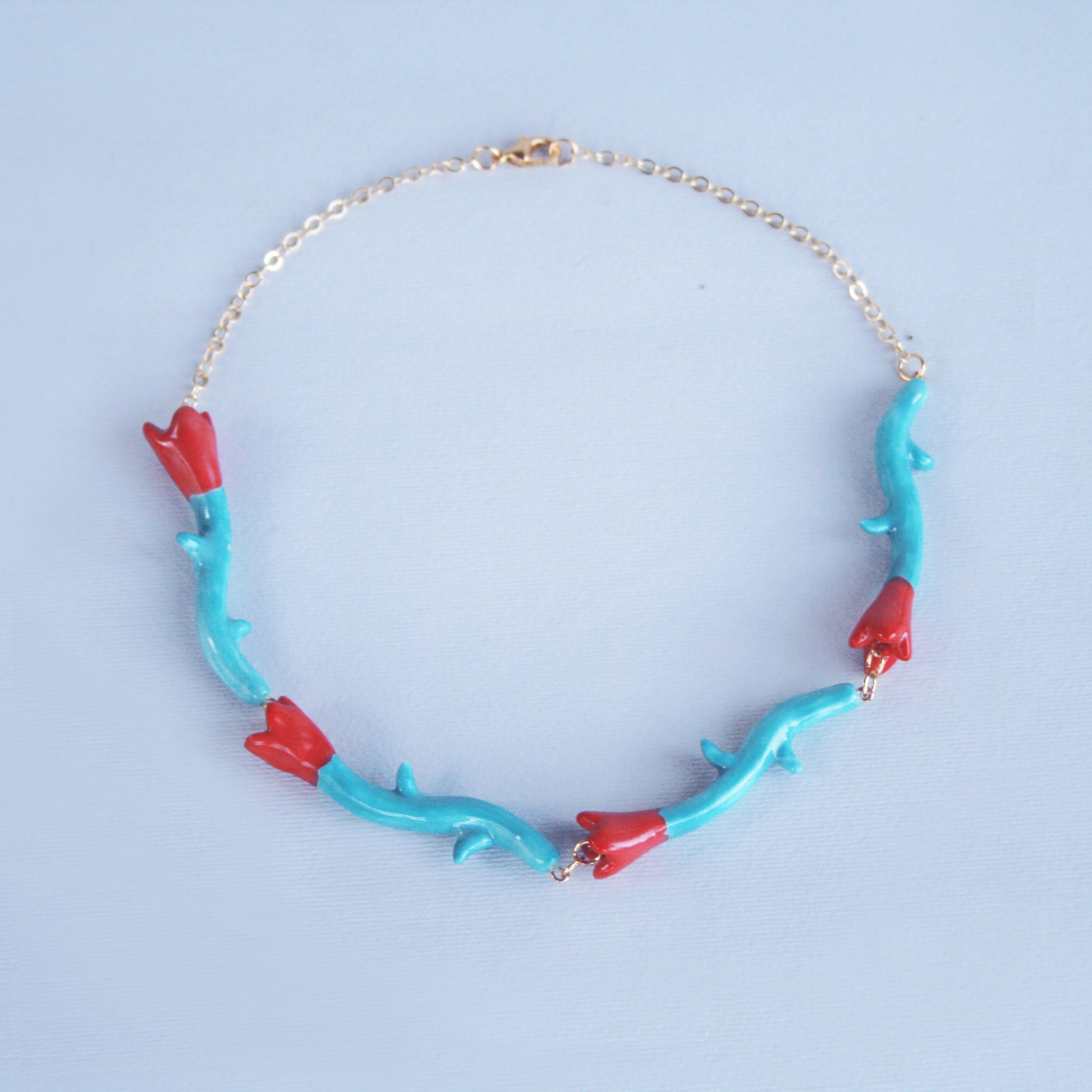 Four red flowers lining up in a girly and romantic chocker necklace. Playful addition that will cheer up any outfit.