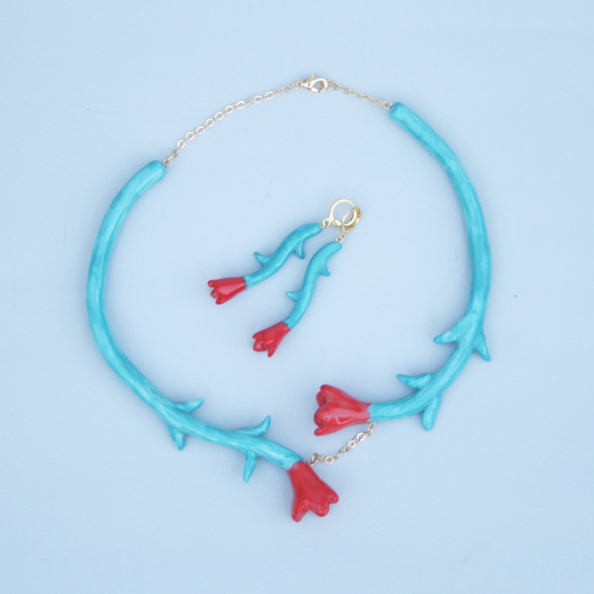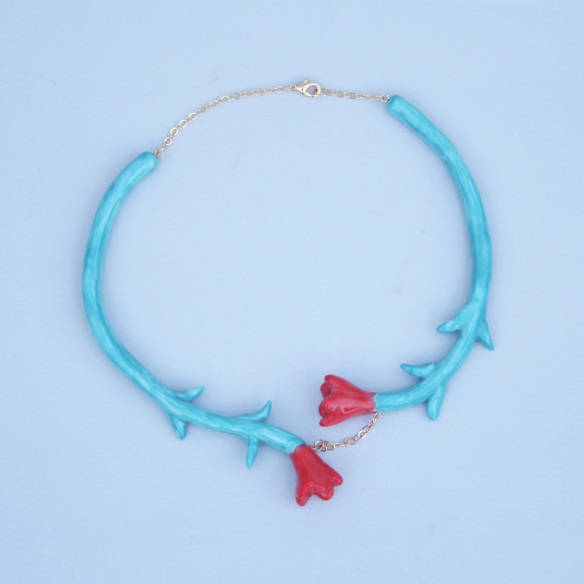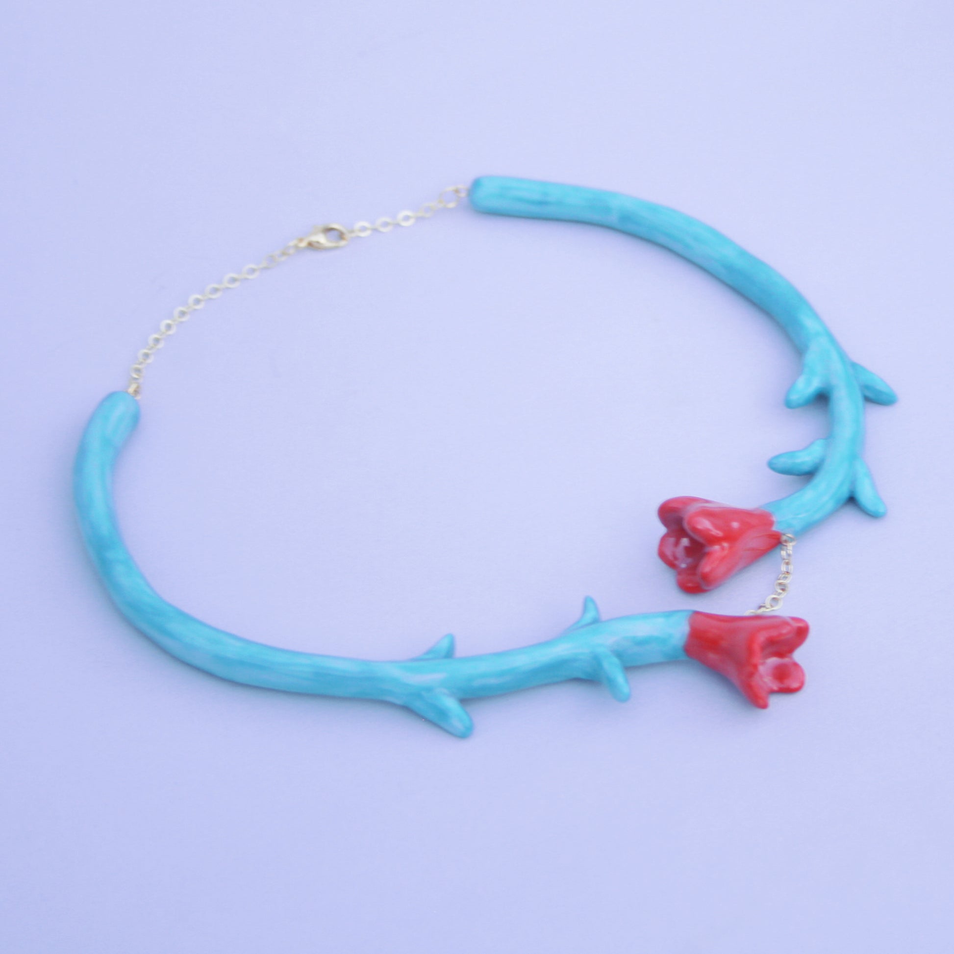 The FLOWER NECKLACE Is a statement and eyecatching piece featuring two porcelain flowers that embrace your neck. Even though the flowers are large they are lightweight and comfortable.