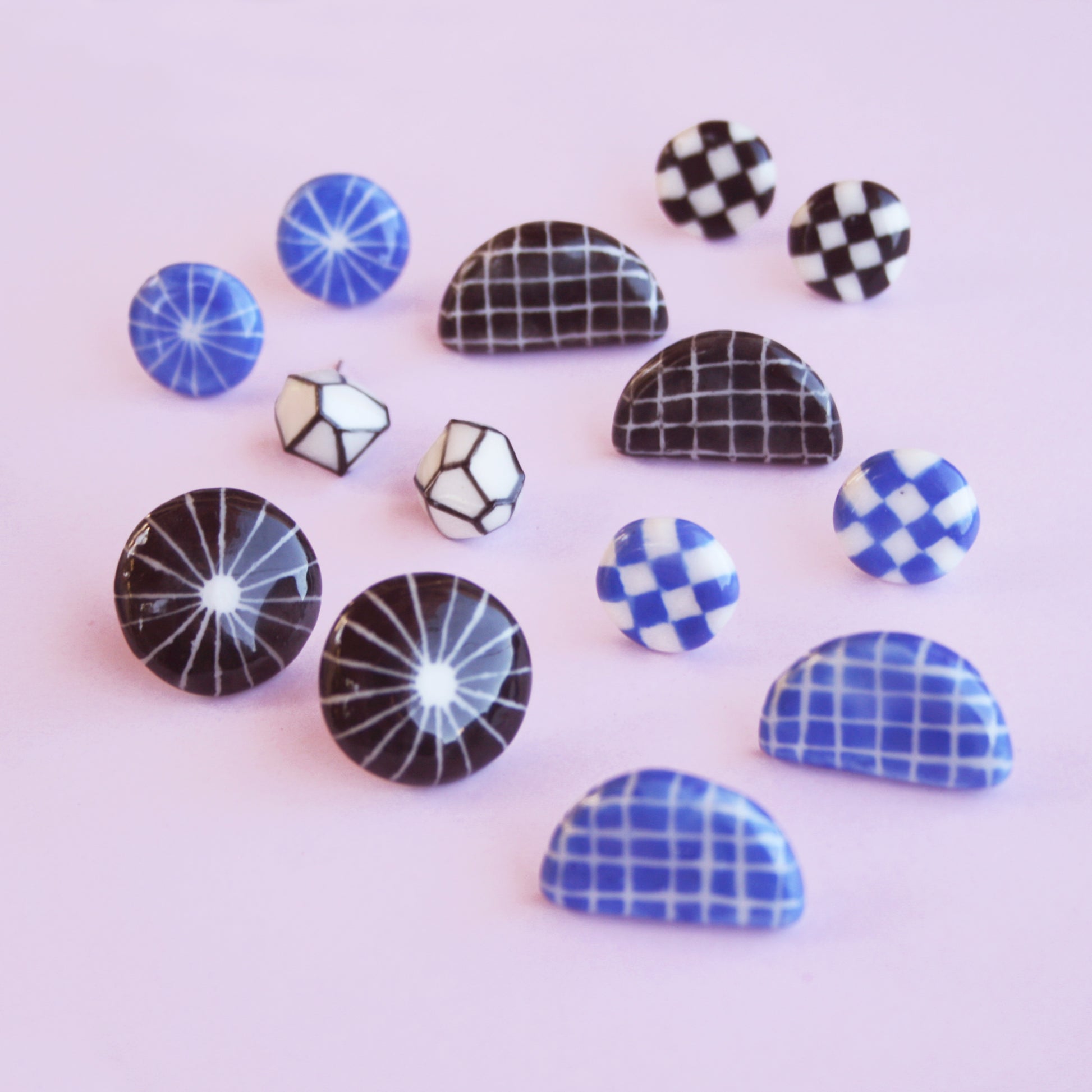 Variety of one in a kind porcelain stud earrings with various patterns and shapes.