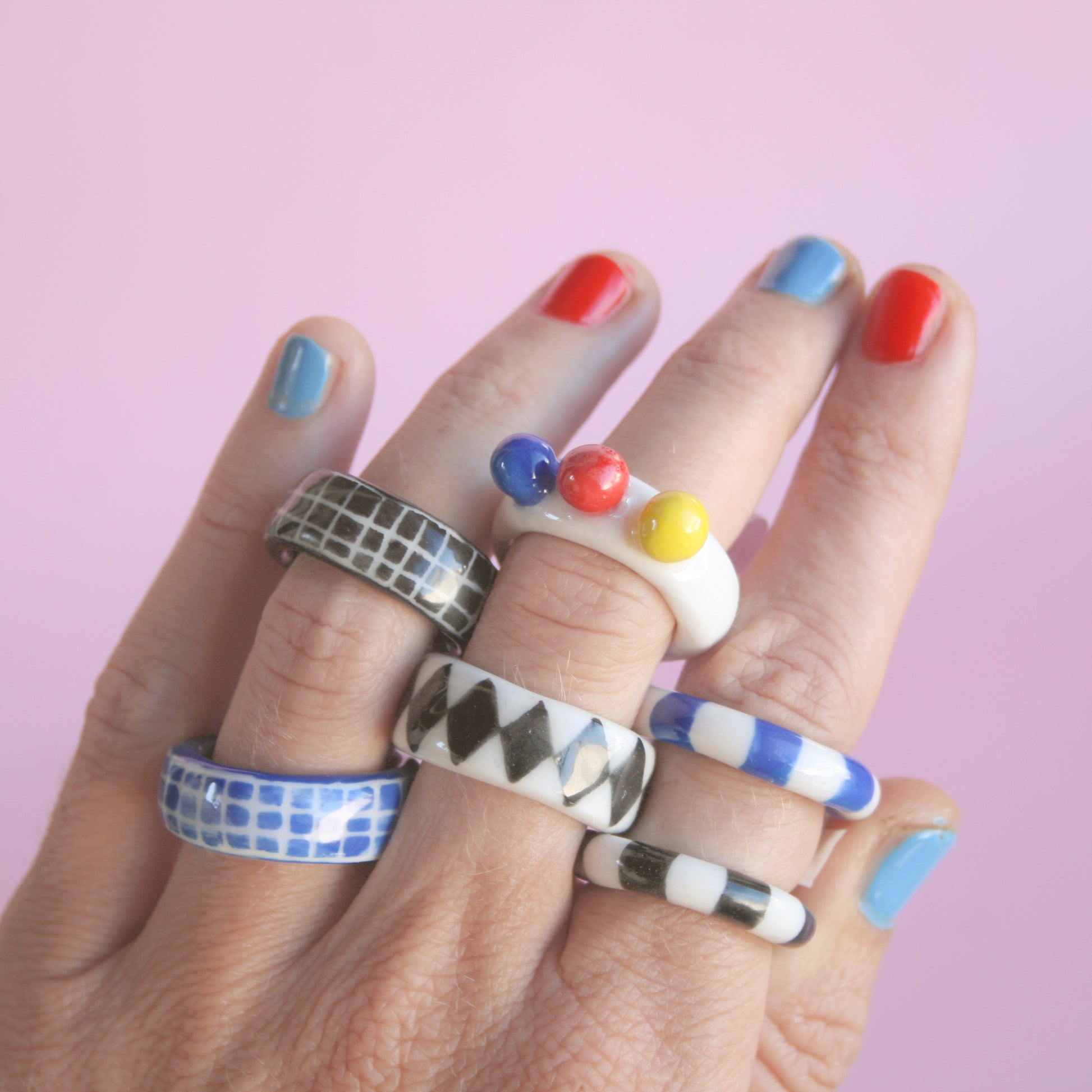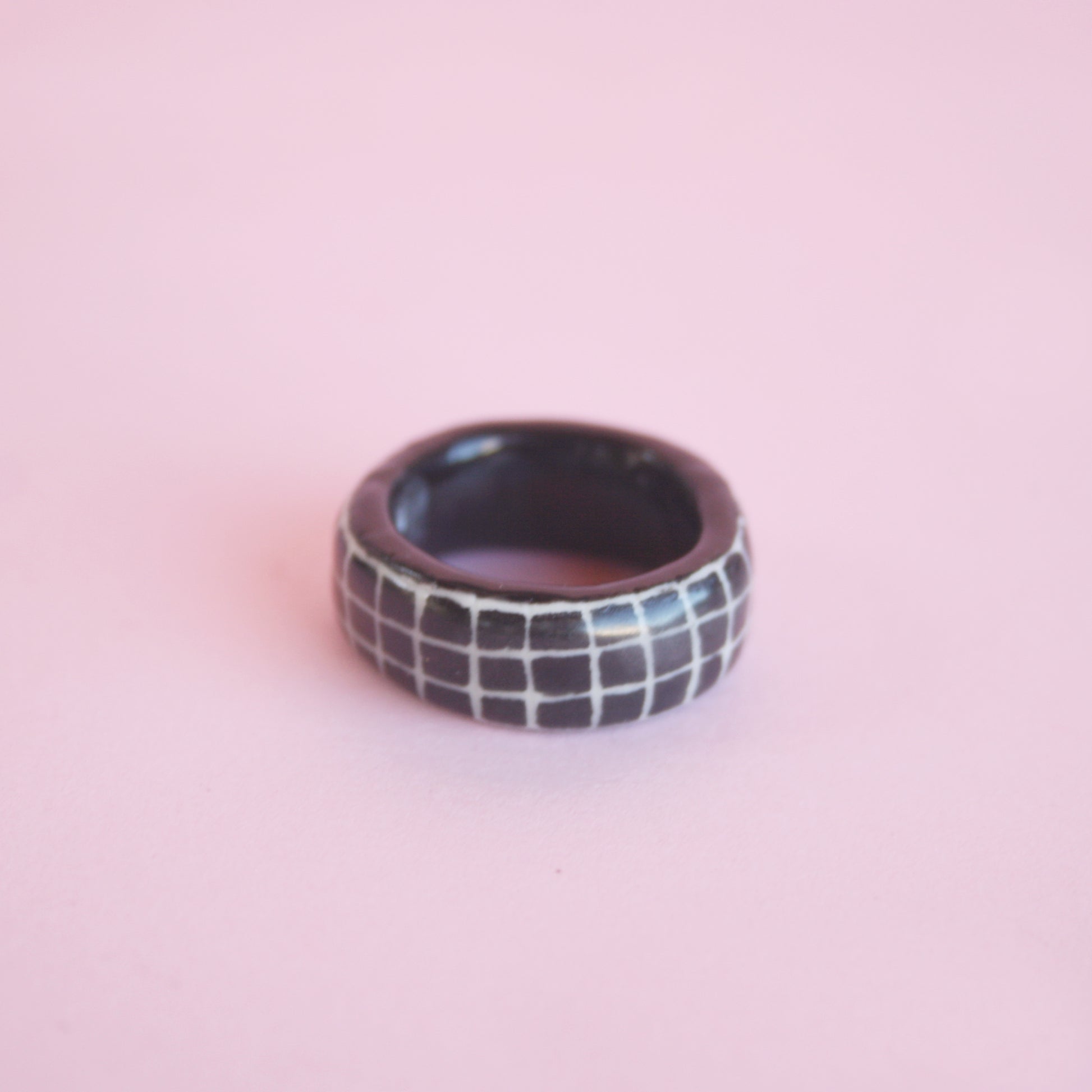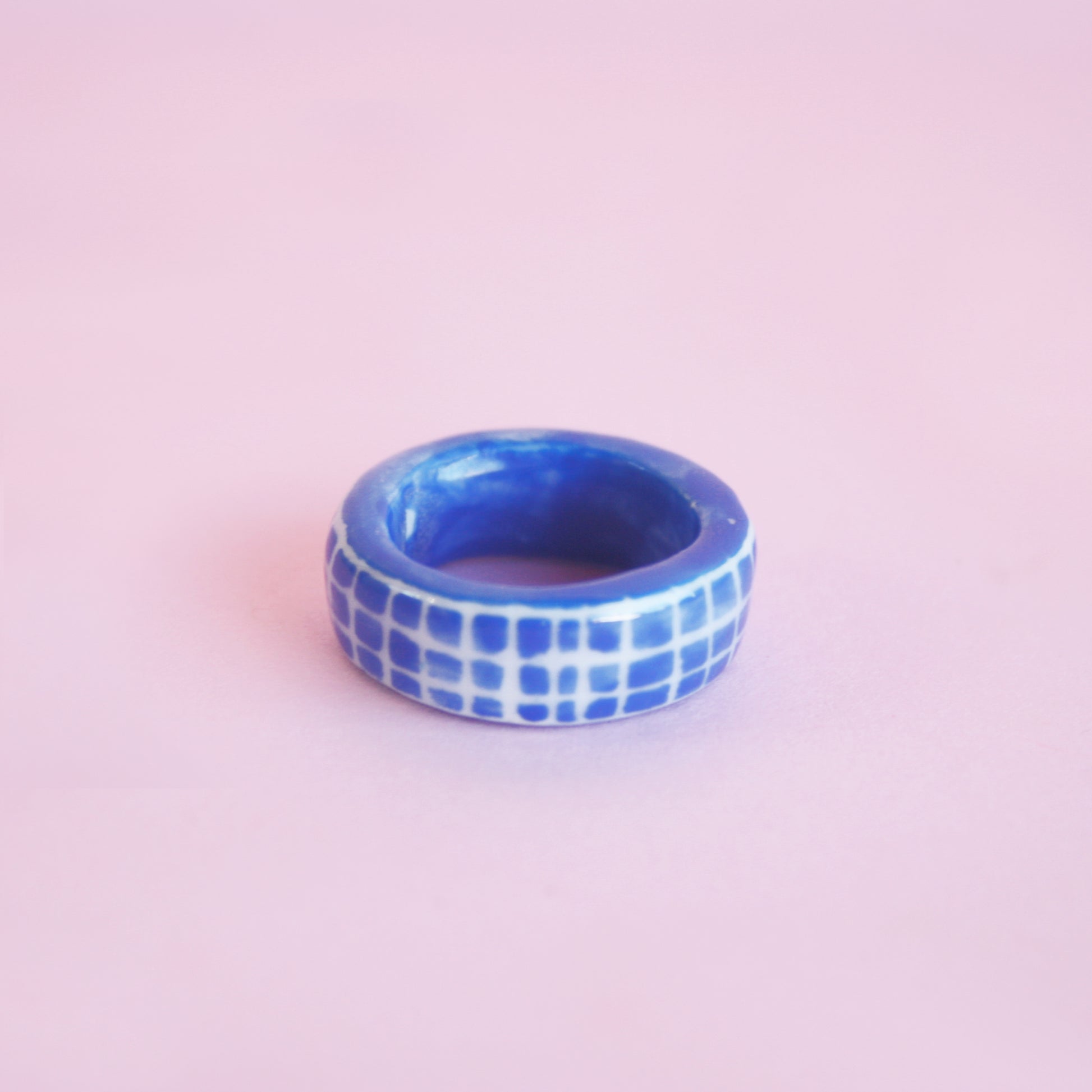 Graphic porcelain ring decorated with sgraffito techinque with the white grid on a black or blue background.