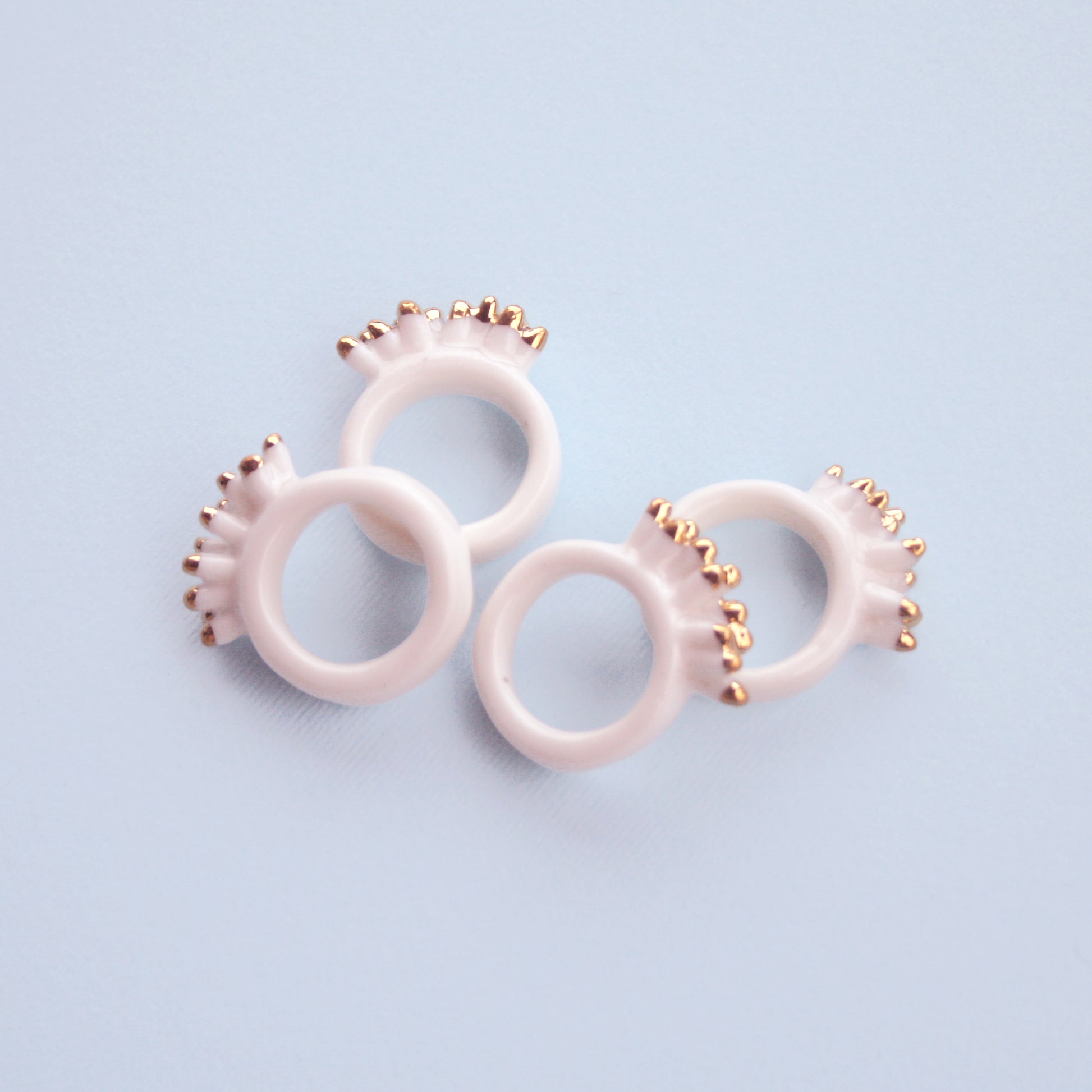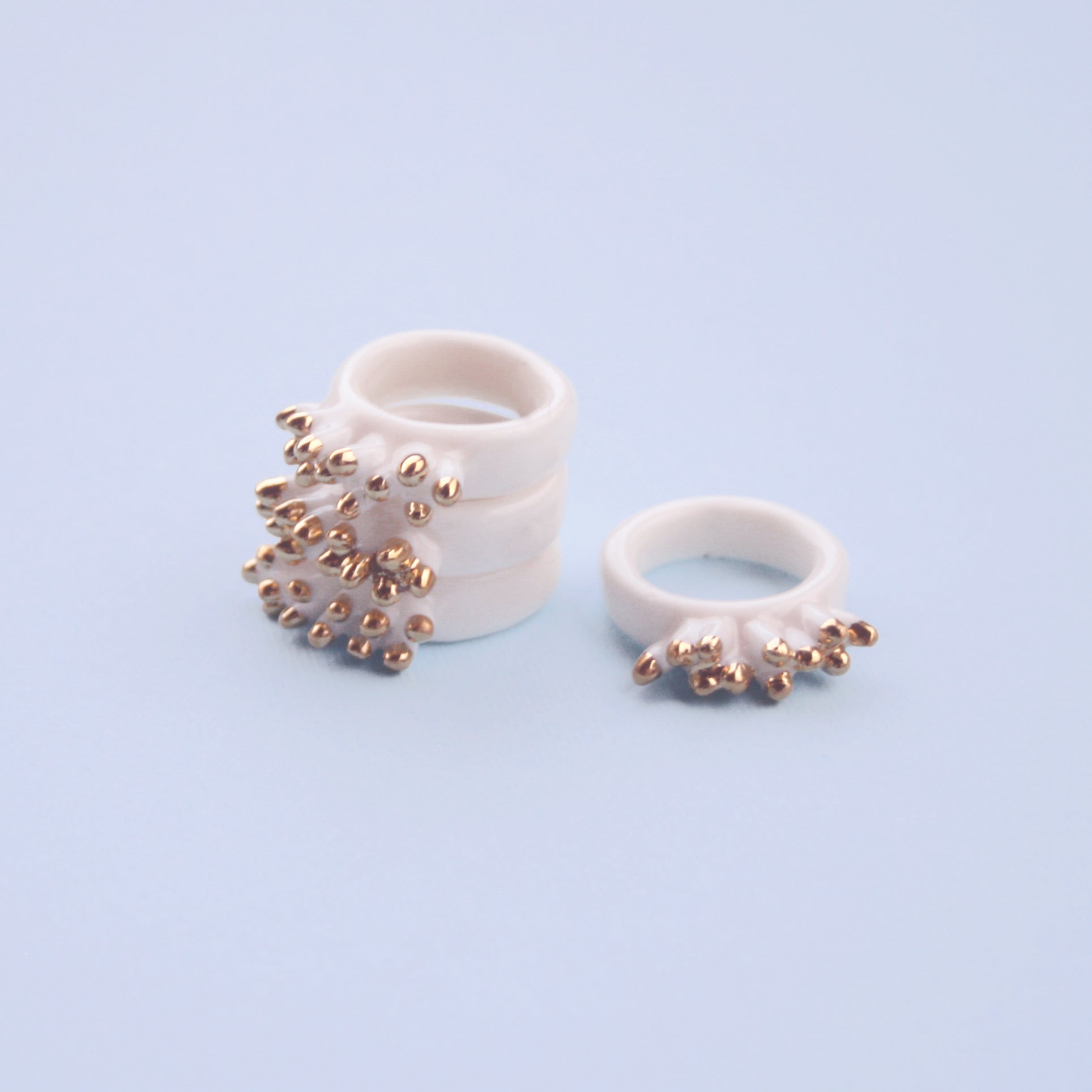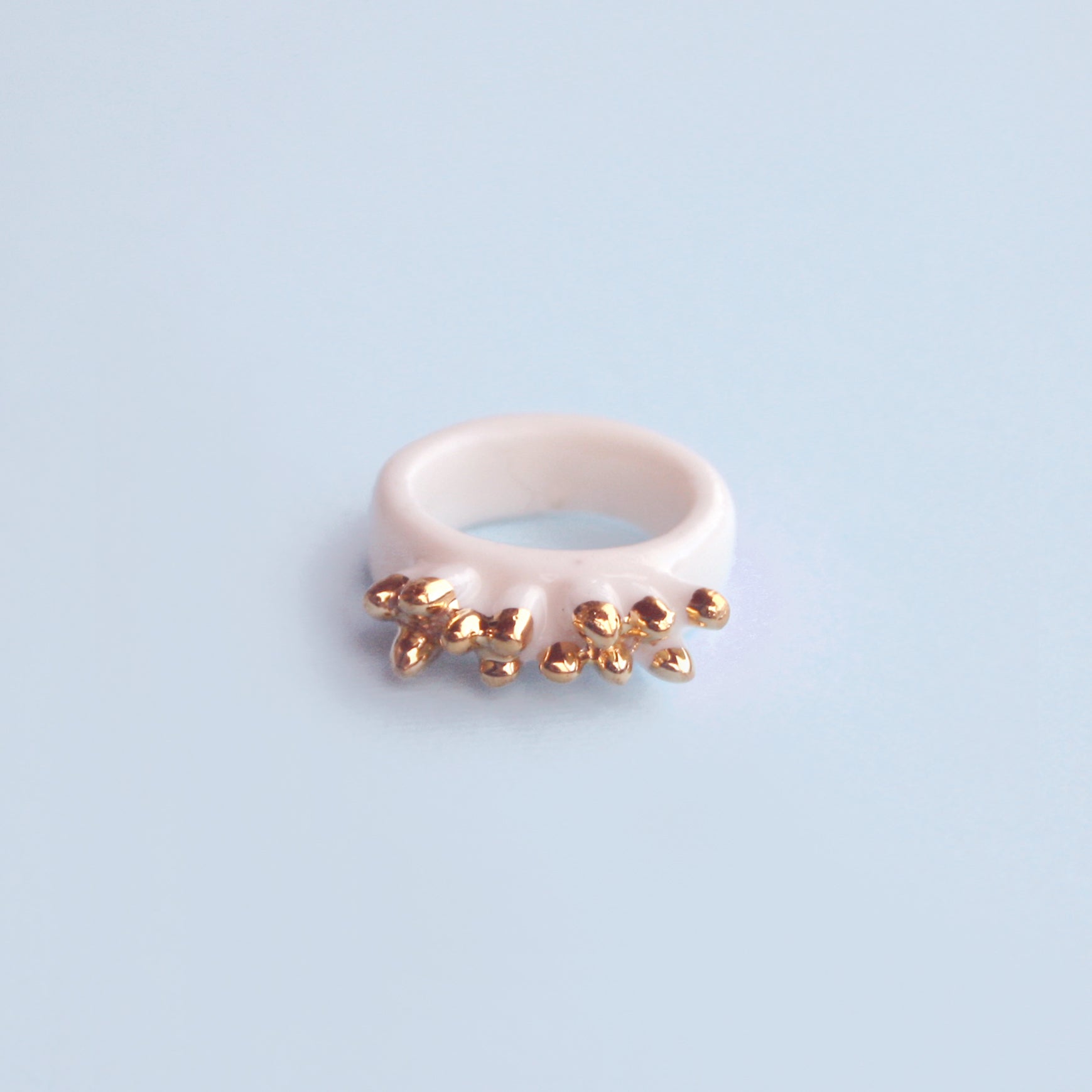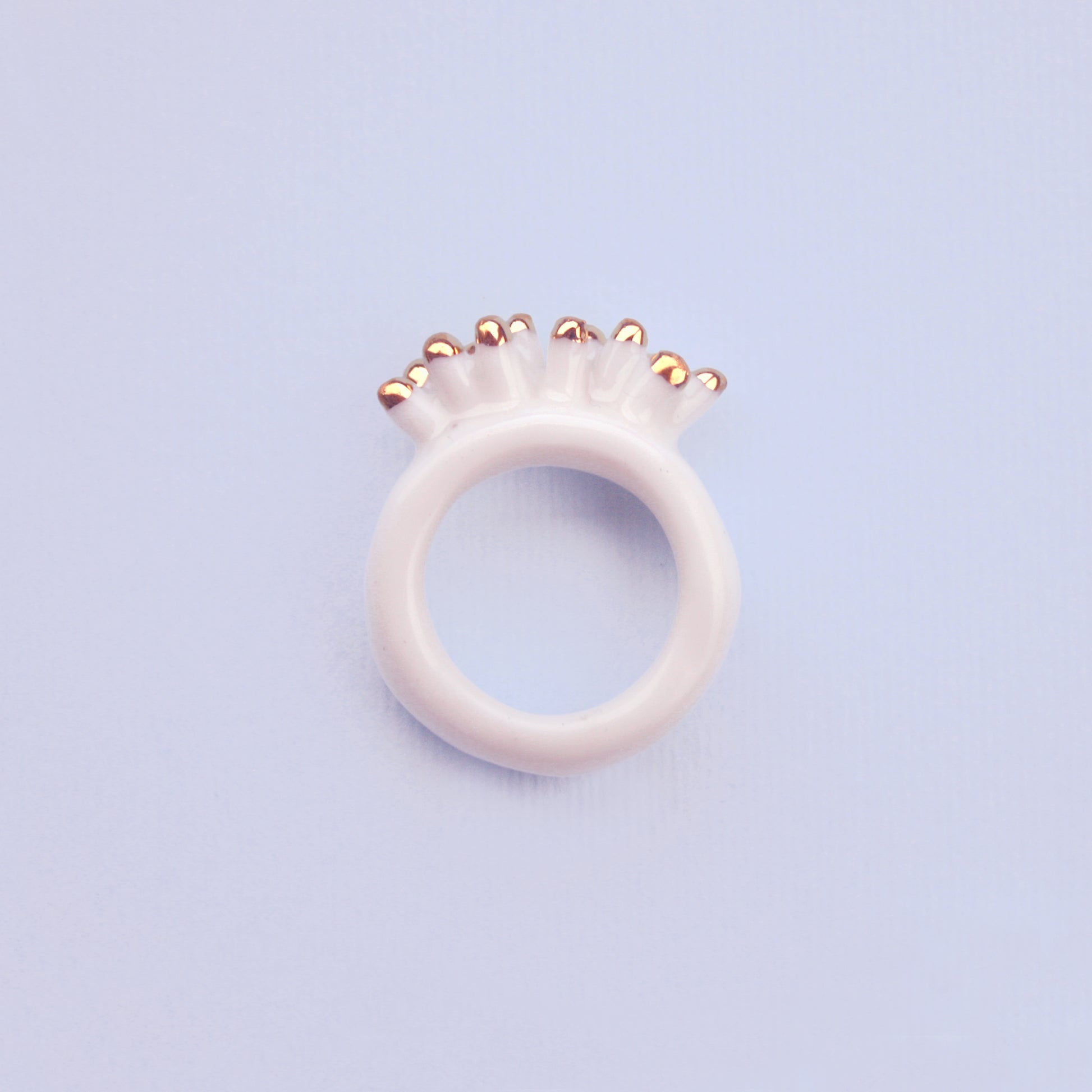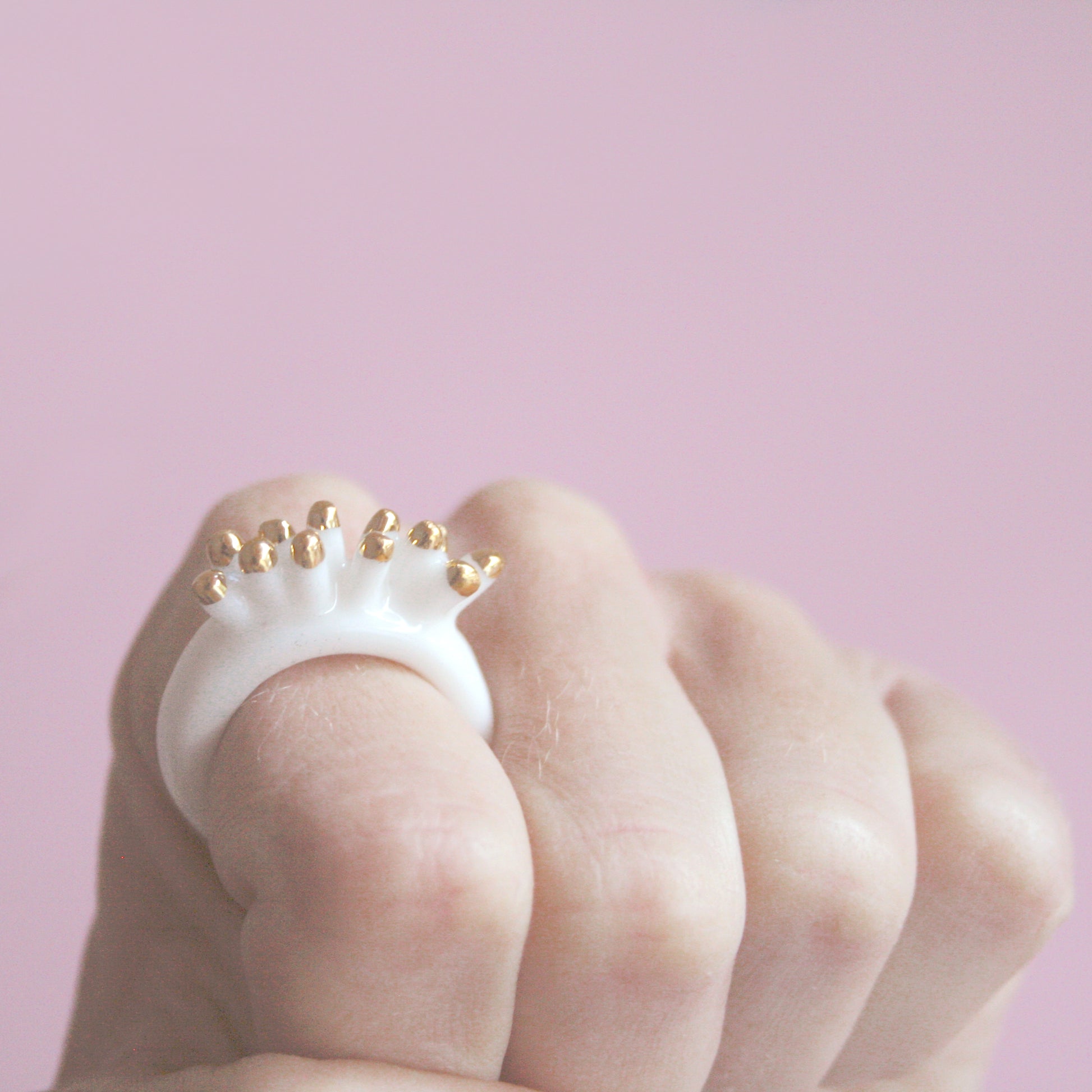The ring was hand formed in porcelain, glazed and fired twice up to temperature of 1240 C degrees. Additionally decorated with real gold and fired for the third time.