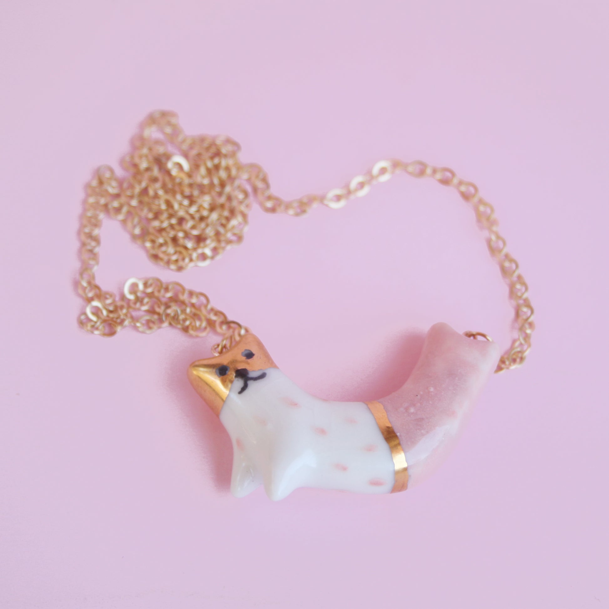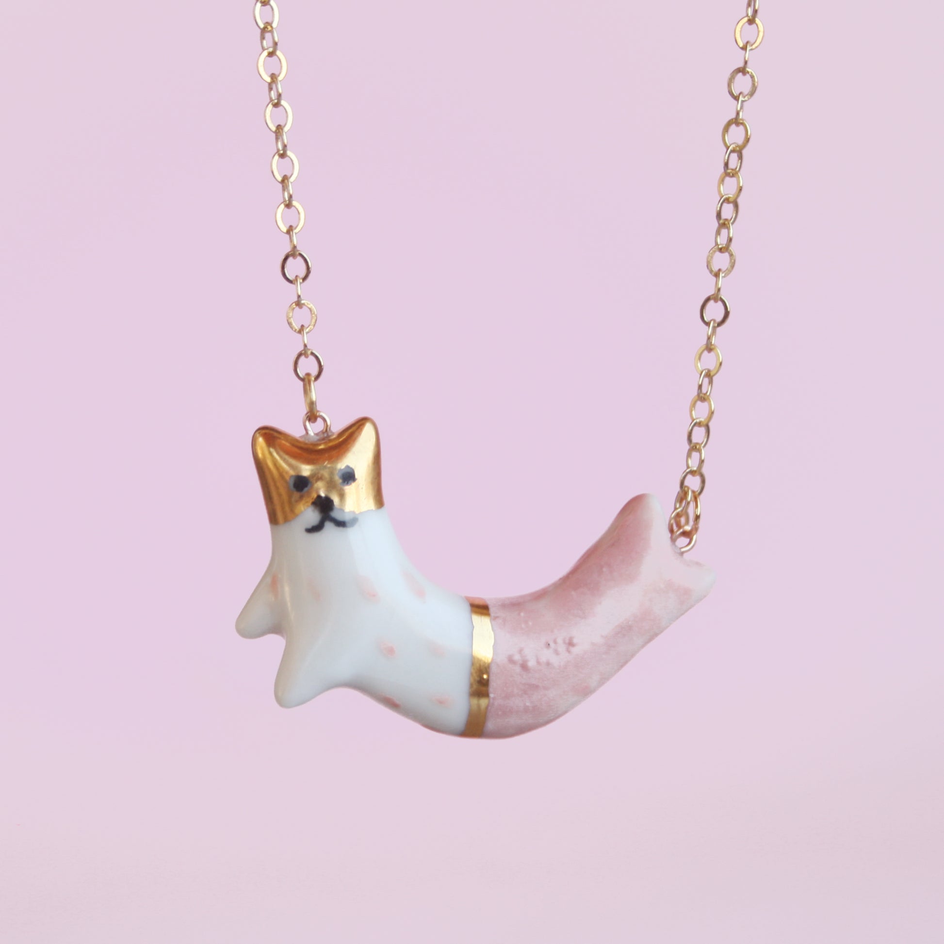 Cute marcat necklace with pastel pink tail and golden mask - perfect companion for your summer adventures by the sea!