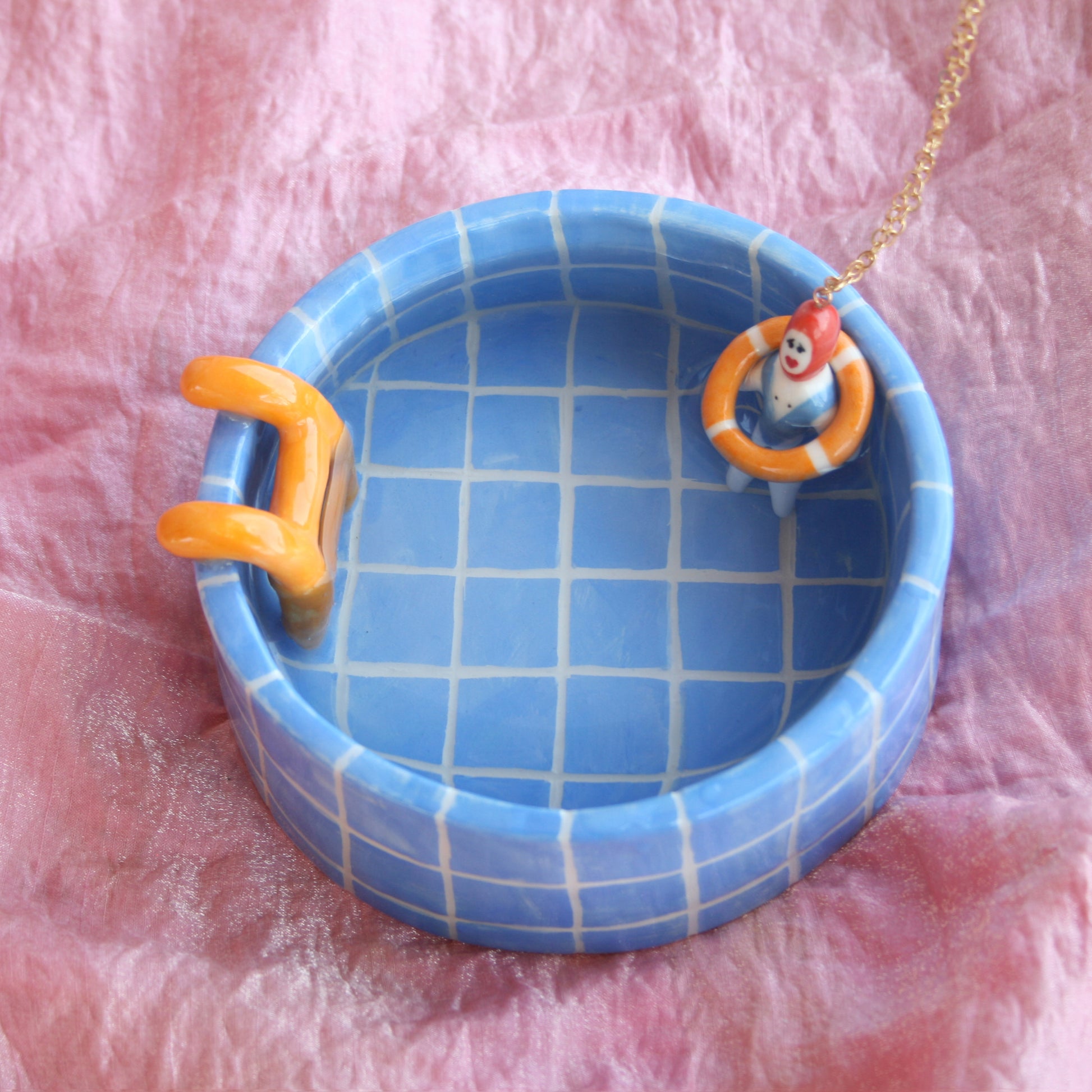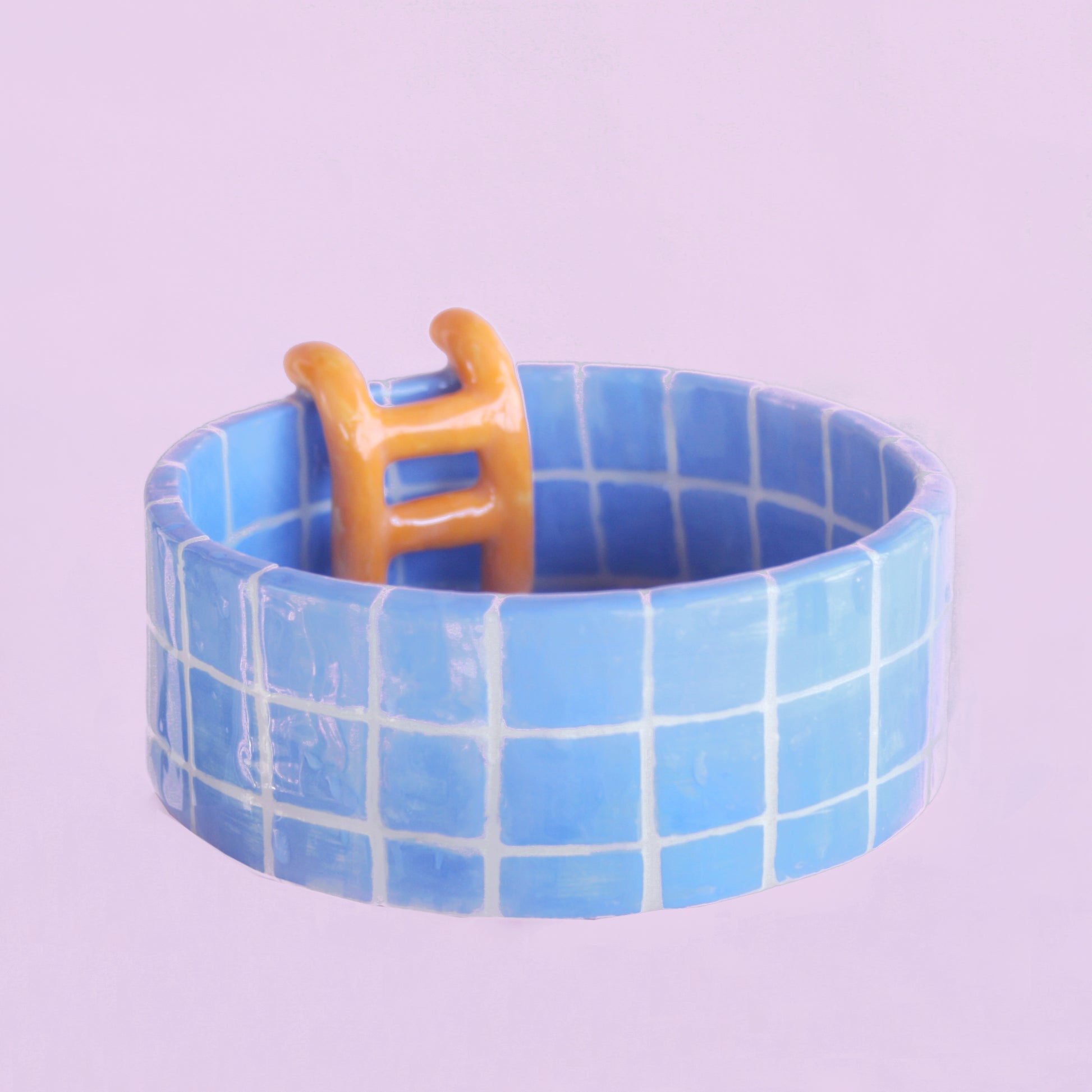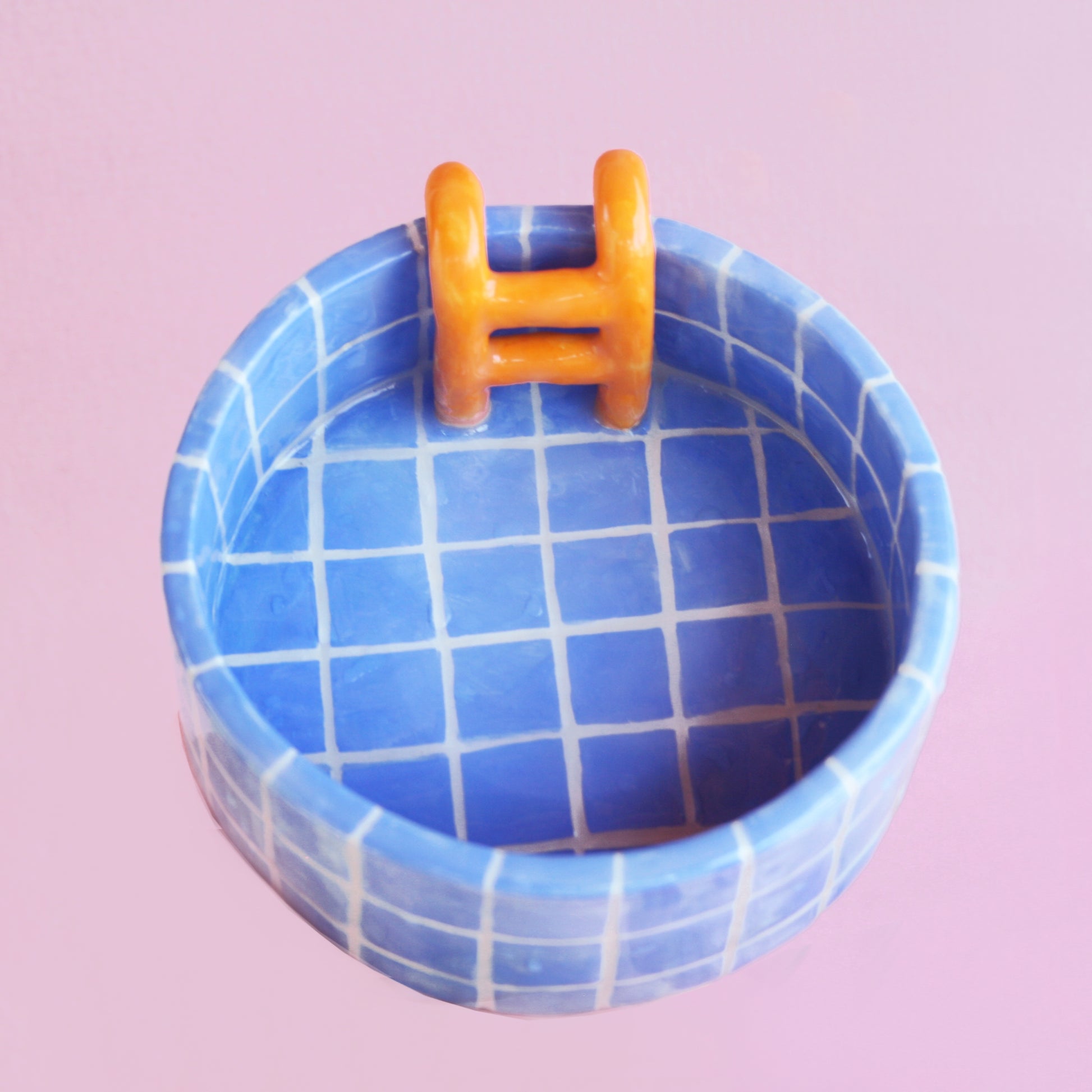 Ceramic swimming pool bowl decorated with blue tiles and orange ladder.