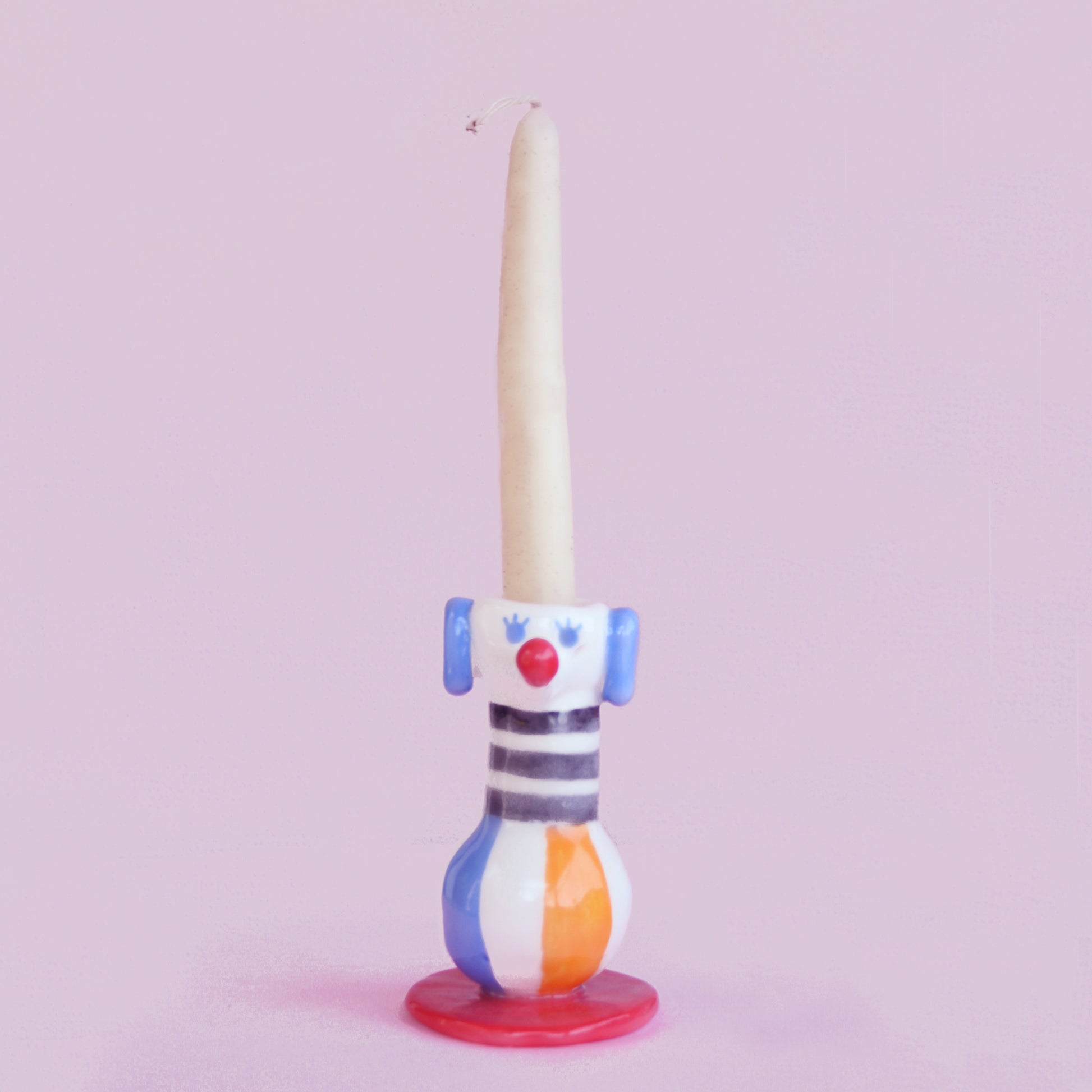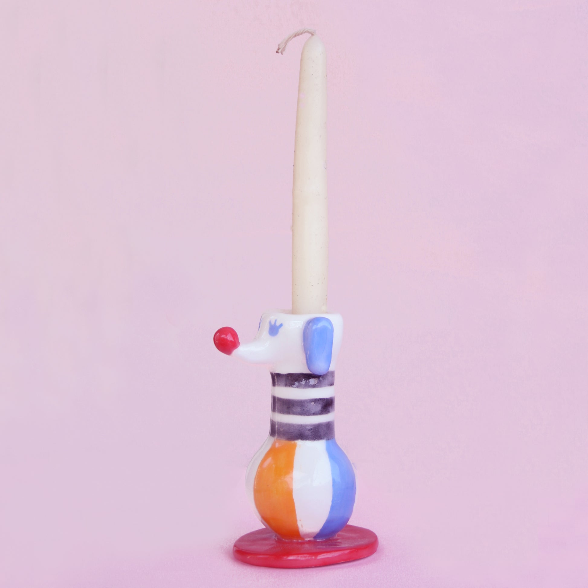 Ceramic candle holder with cute weenie dog , decorated with colorful patterns.
